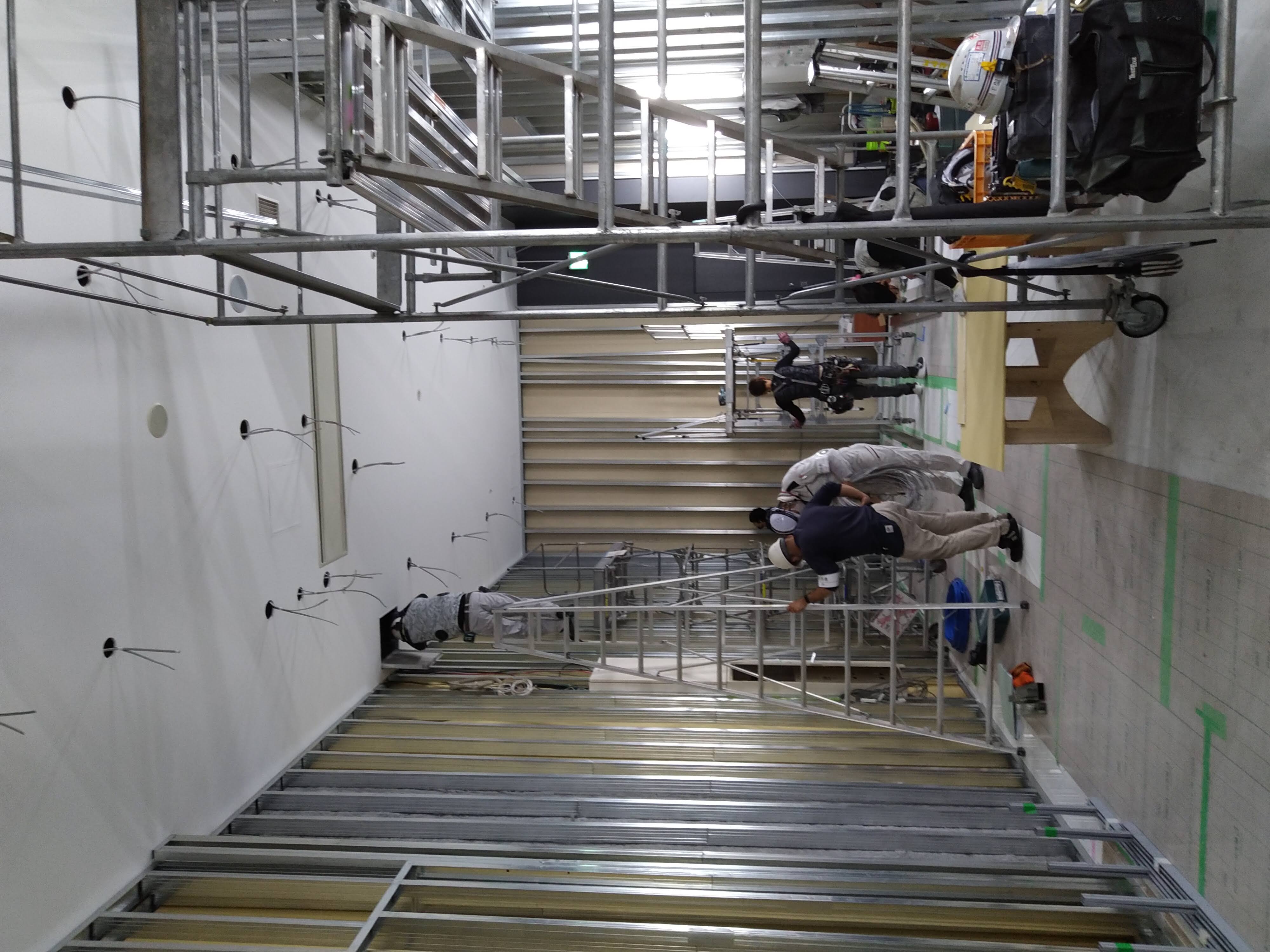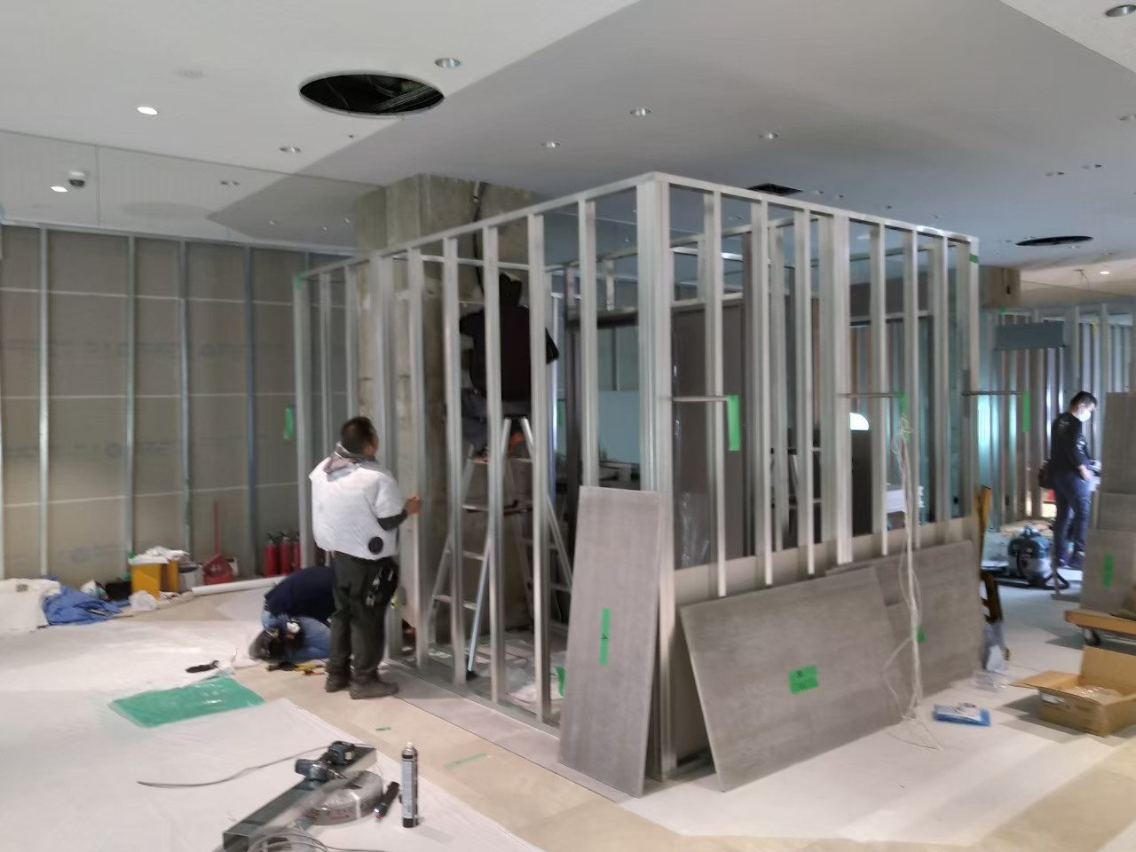 テナントの内装工事などで「壁」を指す際の一般的な呼称として使われている言葉で、Light Gauge Steel(Light Gauge Stud)の略で、軽量鉄骨のことを指します。LGSで下地を作り、その上に石膏ボードなどを貼り付け、その上にクロスや塗装を施して、壁を仕上げていきます。この下地(骨組み)を作る工事を軽天工事(軽量鉄骨で天井までの骨組みを作る工事)と言います。